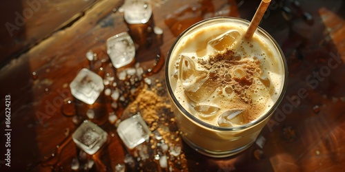 Bird's eye view of iced latte in glass with ice cubes and straw. Concept Food Photography, Beverage Shots, Iced Coffee, Refreshing Drinks, Summer Vibes