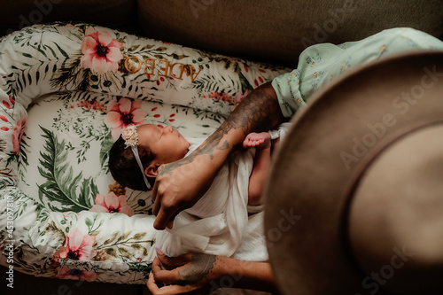 Bird's eye view of mother changing her baby daughter.