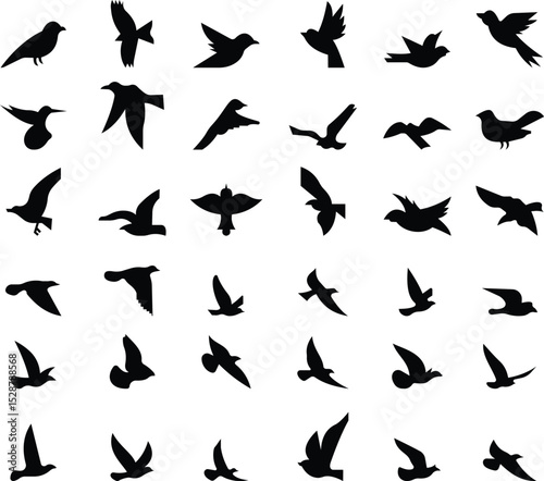 Birds icon set, Flying birds, animals, black silhouette, monochrome bird logo, abstract sticker on house wall or glass, Printable, protect birds from impact vector symbols, template designs art