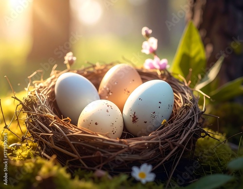 Bird's nest with four varied colored eggs nestled on moss in sunlit forest setting