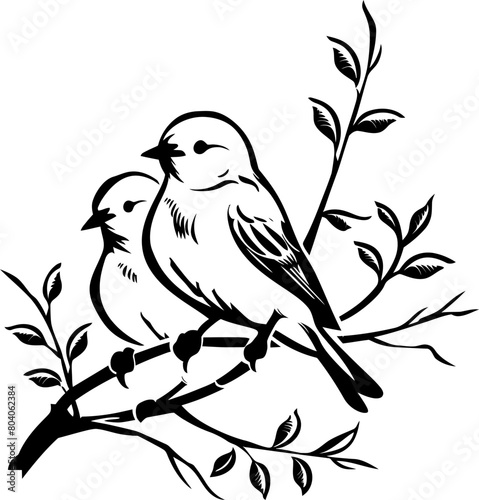 Birds on branch with leaves silhouette in black color. Vector template illustration.