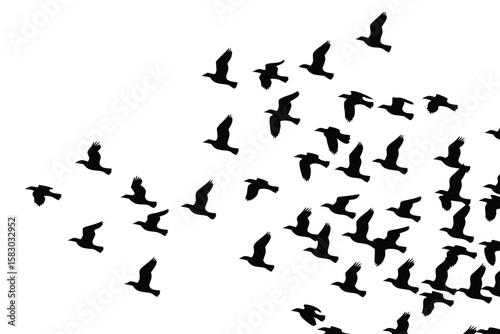 Birds Silhouettes Flying Flock of Crows Soaring Against White Background, Migration Pattern
