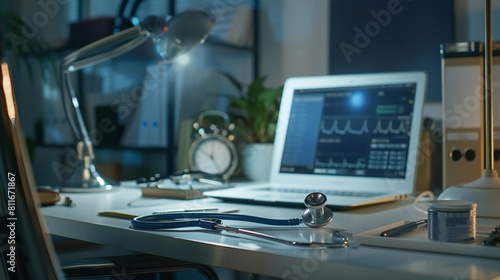 Bird's-eye shot showcasing the strategic placement of a stethoscope, medical folder, and computer on the desk.