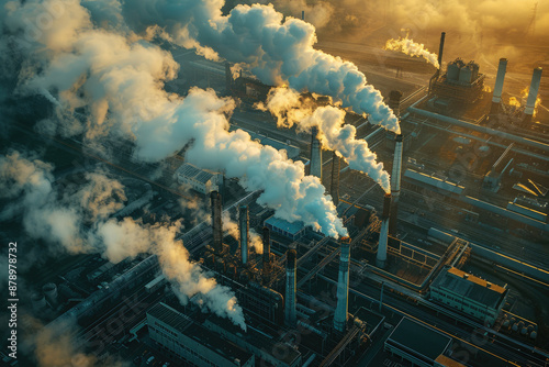 Bird's-eye view of the chimney of the power plant emitting thick smoke