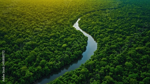 Bird's-eye view of the dense green forests and winding river of the Tingo Maria National Park