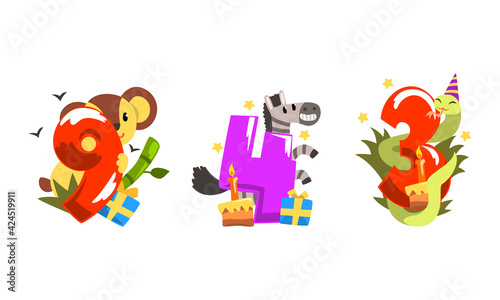 Birthday Anniversary Numbers with Cute Animals Set, Funny Koala, Zebra, Snake with Nine, Four, Three Numbers Cartoon Vector Illustration