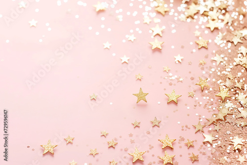 Birthday Background Pastel Peach Colours delicate powder pink Glitter Stars falling with soft caramel brown copy space