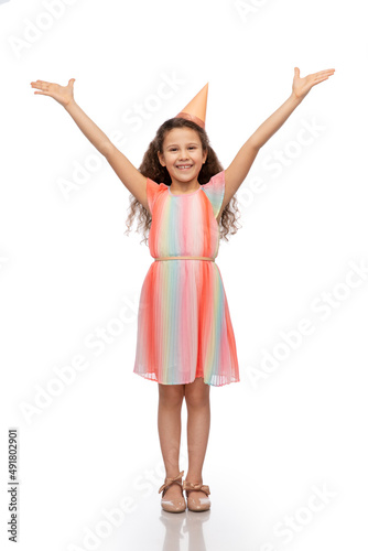 birthday, childhood and people concept - portrait of smiling little girl in dress and party hat with raised arms over white background