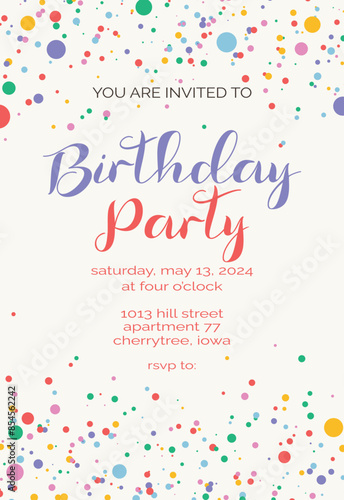 Birthday invitation template with confetti. Flyer, booklet, leaflet concept with flat illustrations. Vector page cartoon layout for magazine. Anniversary celebration invitation with text.