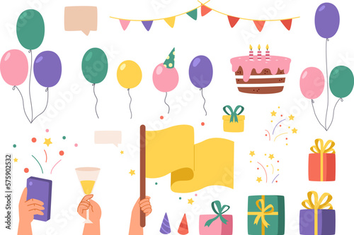 Birthday party cartoon elements. Colorful balloons, cake with candles, flags garlands, gifts and fireworks. Hand hold glass of wine, flag and smartphone, vector festive clipart