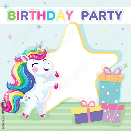 Birthday party invitation. Template with cute and happy unicorn with multi-colored hair and star. Poster, Banner, Flyer. Vector illustration in flat cartoon style