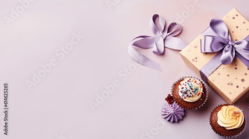 Birthday theme with cupcake dessert and gift box flat lay on pink background. Gennerative Ai