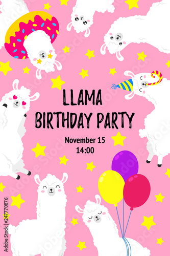 Birthday vector cartoon greeting card design. Doodle illustration. Template, background for print, design. Funny poster with funny lamas. Happy birthday party