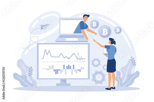 Bitcoin concept vector illustration of young people using laptop and smartphone for online funding and making investments for bitcoin and blockchain. flat vector modern illustration
