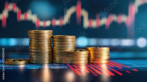 Bitcoin Cryptocurrency Investment Growth Stacks of Gold Coins on a Stock Market Chart Background Representing Financial Success and Digital Currency