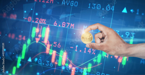Bitcoin gold coins in business hands and blurry chart background, Concept of virtual currency