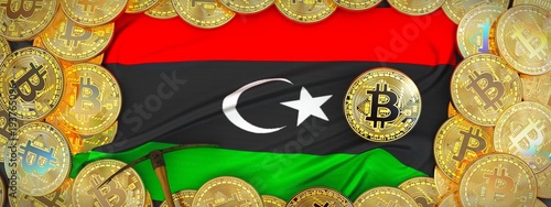 Bitcoins Gold around Libya flag and pickaxe on the left.3D Illustration.
