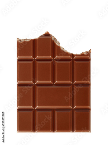 Bitten milk chocolate bar isolated on white background