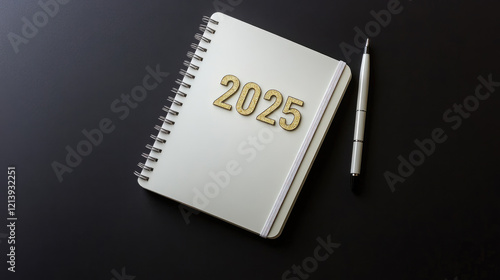 Black - Backed White Notebook, Golden '2025' Pen, for New Year Design, with Space for Text.