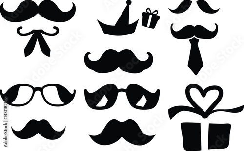 Black & White Mustache Party Props Vector Set: Silhouettes of Glasses, Bow Ties, Gifts, & Birthday Hat for Photo Booth Fun