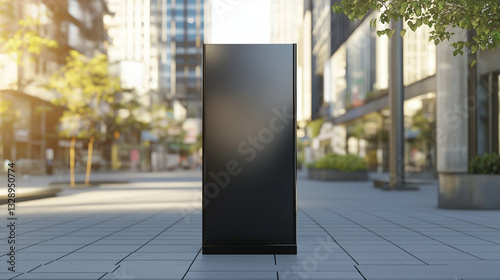 Black advertising billboard standing on a modern city street. Blank urban signage mockup for branding, outdoor ads, or promotions.