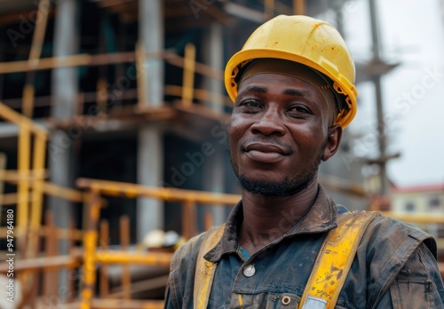 Black African American worker construction in hard safety helmet hat at work on construction site. Labour day concept
