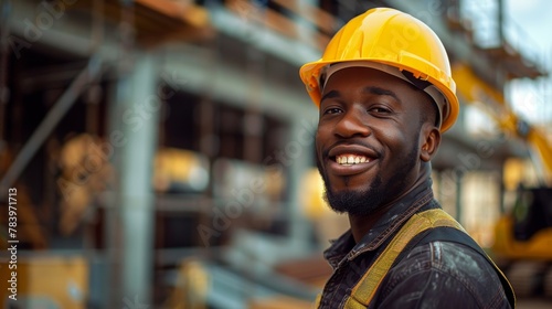 Black african american worker construction in hard safety helmet hat at work on construction site. Labour day concept. Generative ai