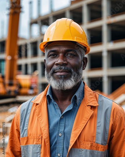 black African middle aged male engineer construction site background portrait with copy space