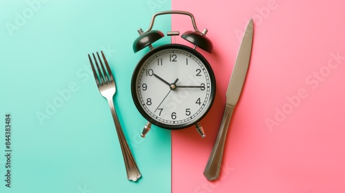 Black alarm clock, fork, knife on colored paper background. Intermittent fasting concept