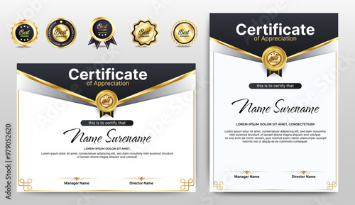 Black and gold certificate of appreciation border template with luxury badge and modern line and shapes. For award, business, and education needs. Diploma vector template