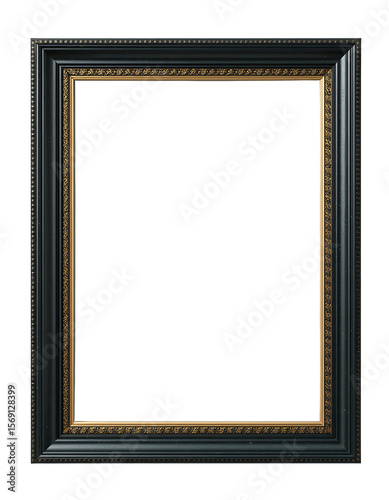Black and gold decorative empty picture frame hanging on plain white wall in vertical position