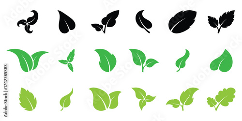 Black and green leaf icon set on white background. Vector isolated leaf icons. Nature leaf icon set. Green leaf icons set.