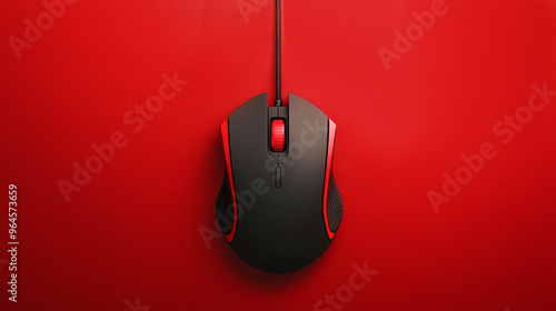 Black and red wired computer mouse against a vibrant red background.