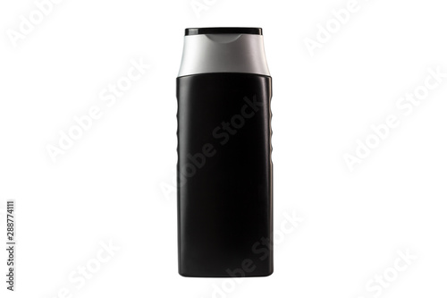 Black and silver color hygiene product container isolated on white background. Capacity for shampoos.