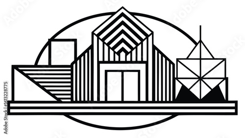 Black and white abstract illustration of a building with geometric shapes and horizontal lines design