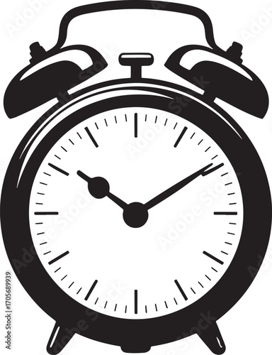 Black and white alarm clock with hands pointing to 9:45 time ticking