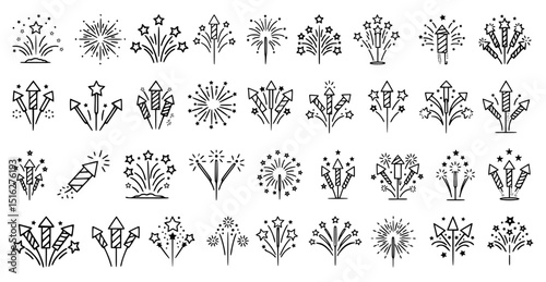 Black and white american patriotic collection of festive fireworks and firecracker silhouette designs