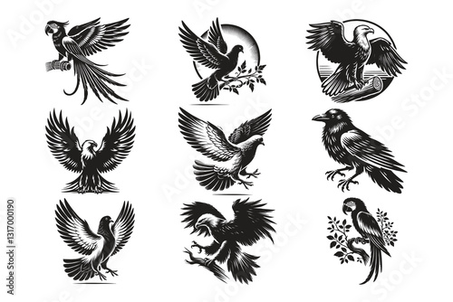Black and White Bird Vector Illustration | Flying & Perched Birds