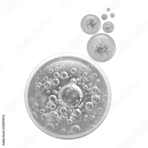 Black and white bubbles air inside a large water bubble isolated on white background. Macro.