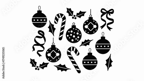 Black and white christmas ornament icons with candy canes and ribbons on a white background design