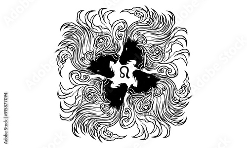 Black and white classic illustration ancient zodiac of leo line art unique ornament