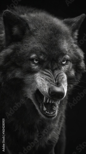 black and white close-up of a gray wolf