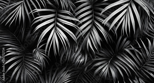 Black and white close-up of tropical palm leaves creating a dense foliage background with copy space for text