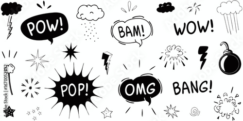 Black and white comic book style sound effects and speech bubbles action alert