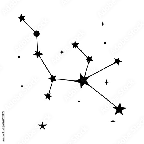 Black and white constellation design with stars and connecting lines on a white background