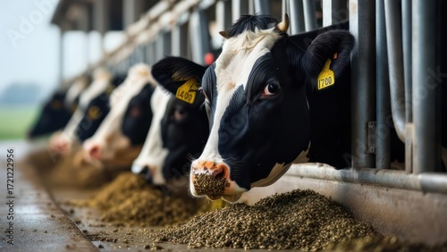 Black and white cows eating feed in a barn