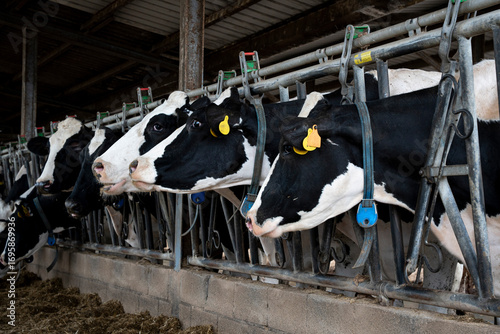 Black and white cows feed calmly inside a barn in an agricultural setting