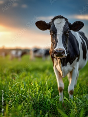Black and white dairy cow walking on green grass at sunset