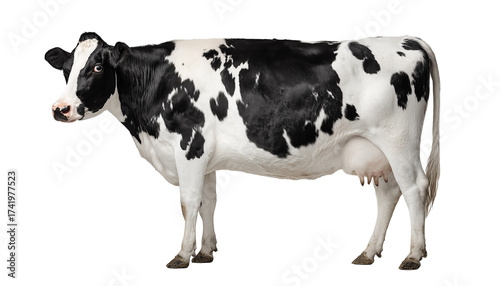 Black and white dairy raw cow standing calmly on a clean isolated on transparent background, Clipart png