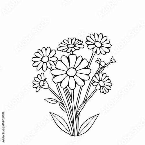 Black and White Daisy Flower Line Drawing Botanical Sketch Minimalist Floral Illustration Hand Drawn Wildflower Bouquet Coloring Book Page